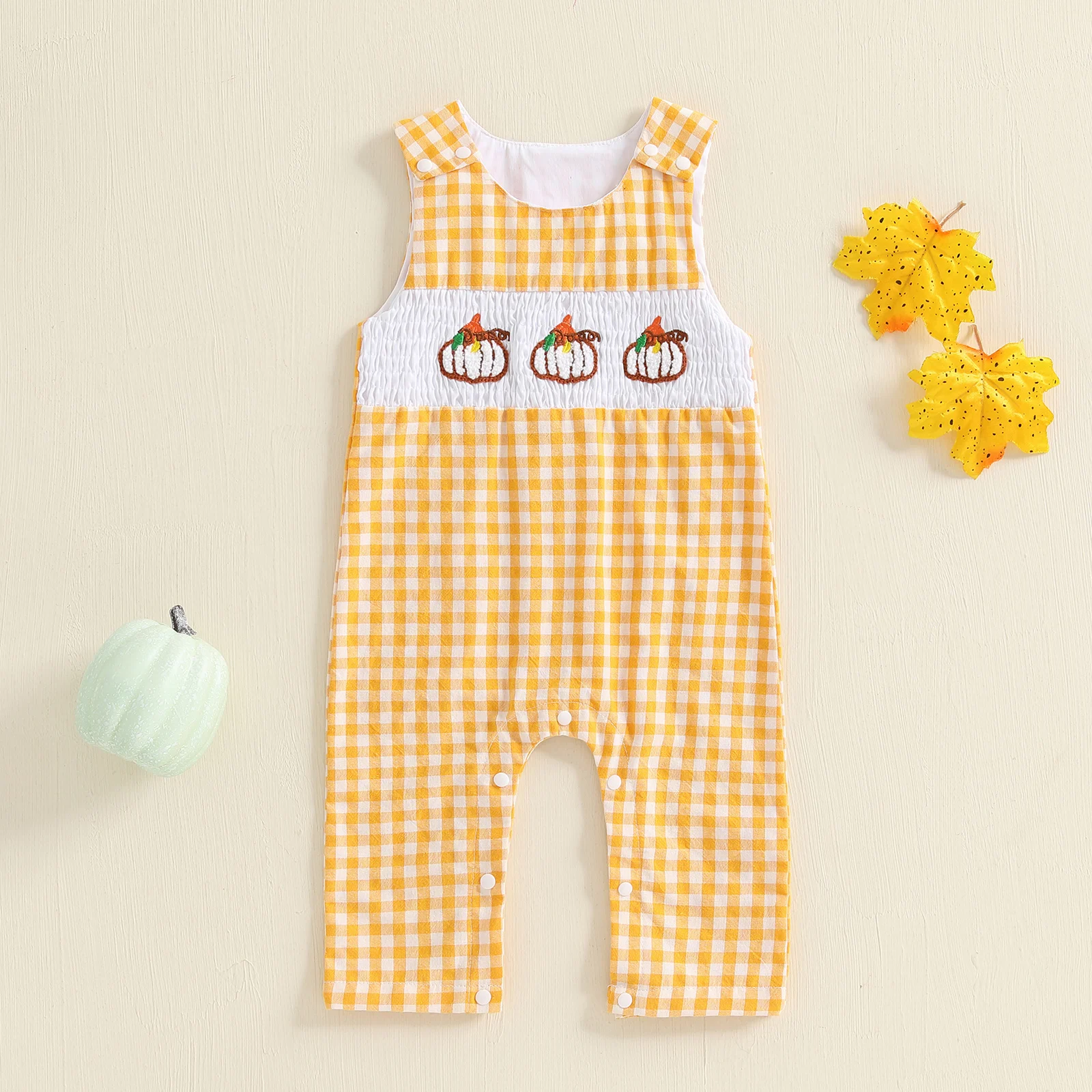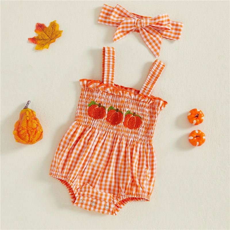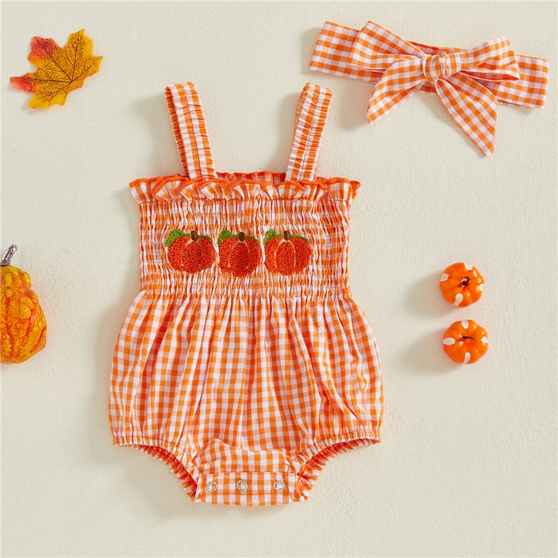 Baby Plaid Halloween Overall Romper Pumpkin Embroidered Smocked Sleeveless Bodysuit Cute Fall Clothes