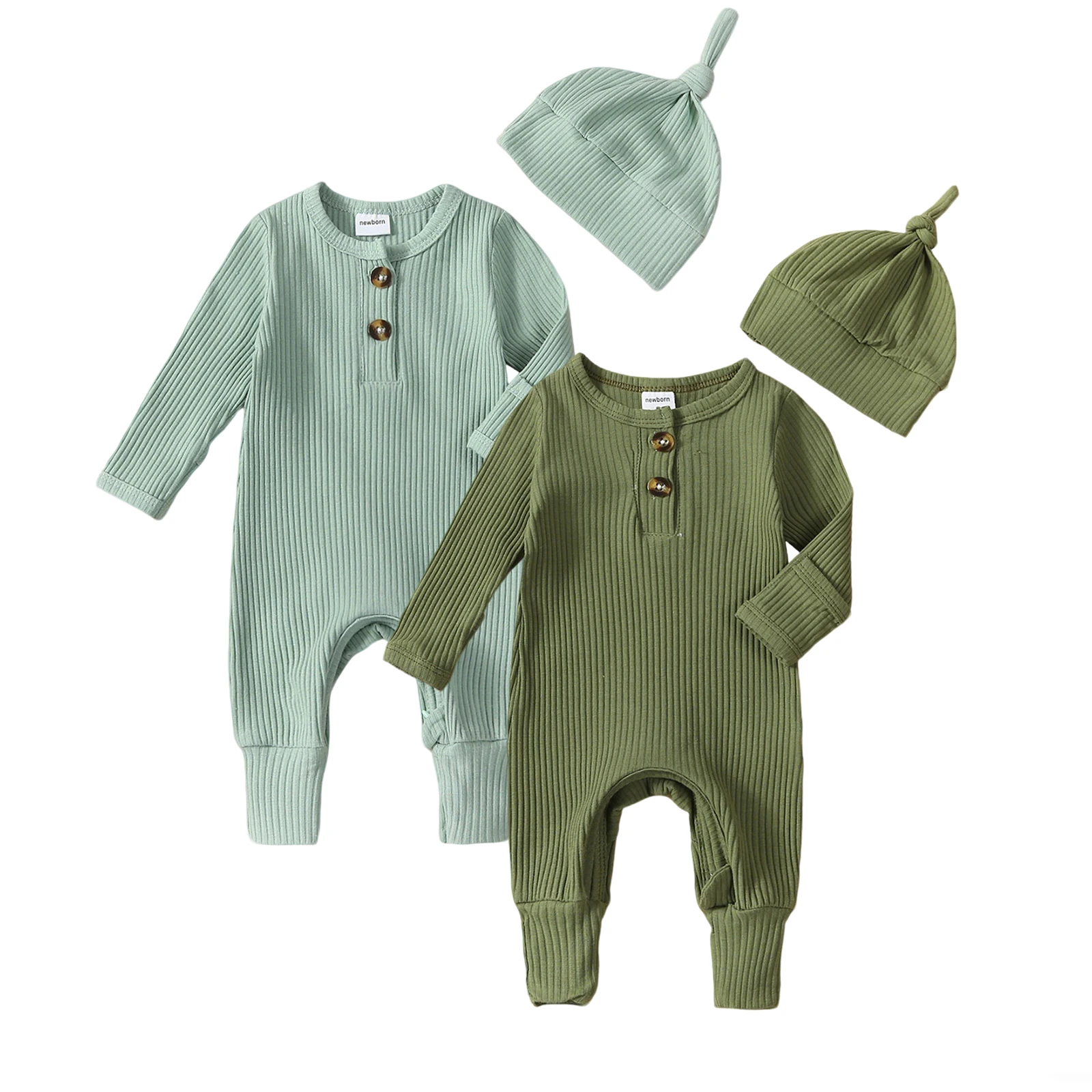 Baby Boy 2 Pieces Outfits Solid Color Ribbed Long Sleeve Romper Jumpsuit with Hat for Infant Toddler Fall Clothes