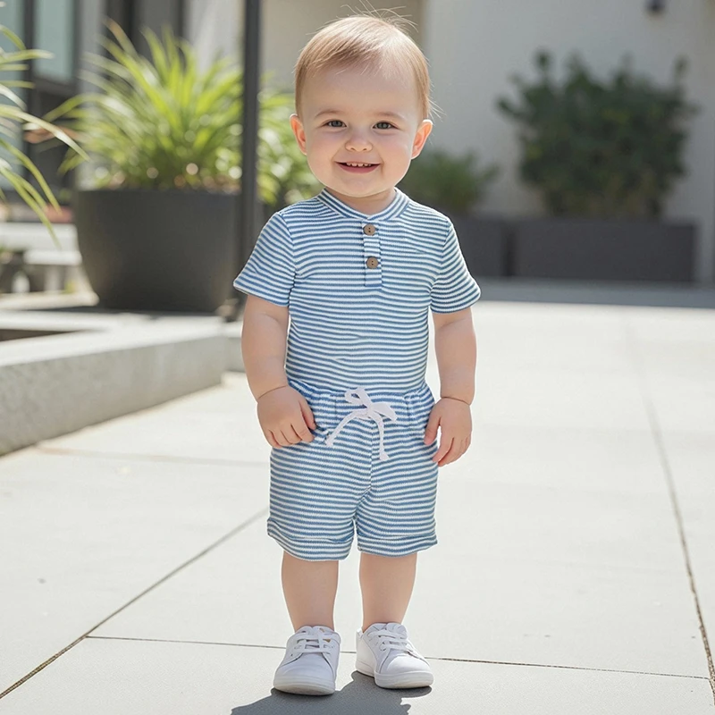 Toddler Boy Striped Shirt and Shorts Set with Half Button-up V Neck and Elastic Waistband for a Stylish Summer Look